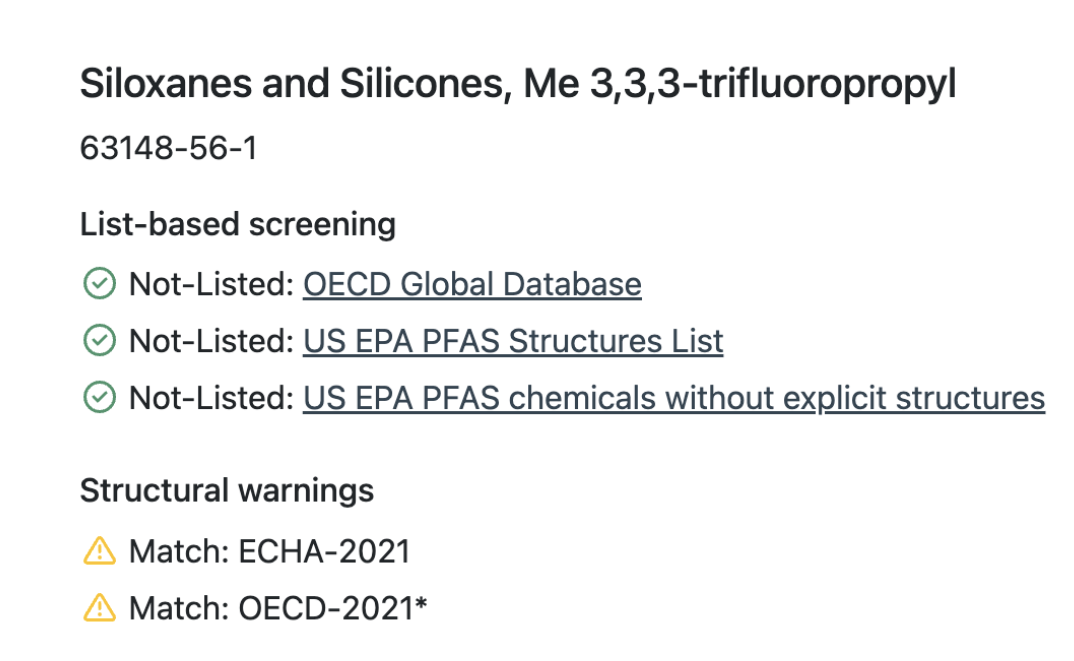 A product team working to phase PFAS out of their supply chain recently evaluated the chemical Siloxanes and Silicones, Me 3,3,3-trifluoropropyl [CAS: 63148-56-1] to determine whether it constitutes a PFAS material and therefore should be targeted for substitution. The chemical did not appear on established PFAS databases, including the OECD Global Database and those from the US EPA. Based solely on list screening, it initially seemed to be a feasible non-PFAS option.